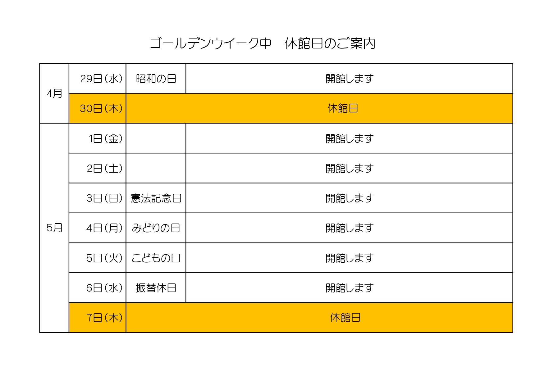 ゴールデンウイーク中の休館日のご案内をします。